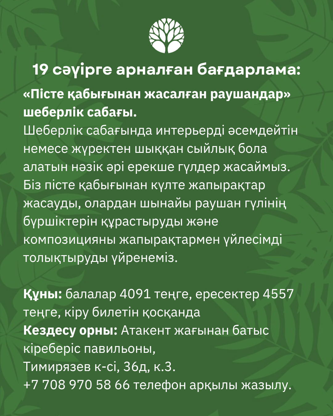 Орын саны шектеулі, алдын ала жазылу қажет: +7 708 970 58 66