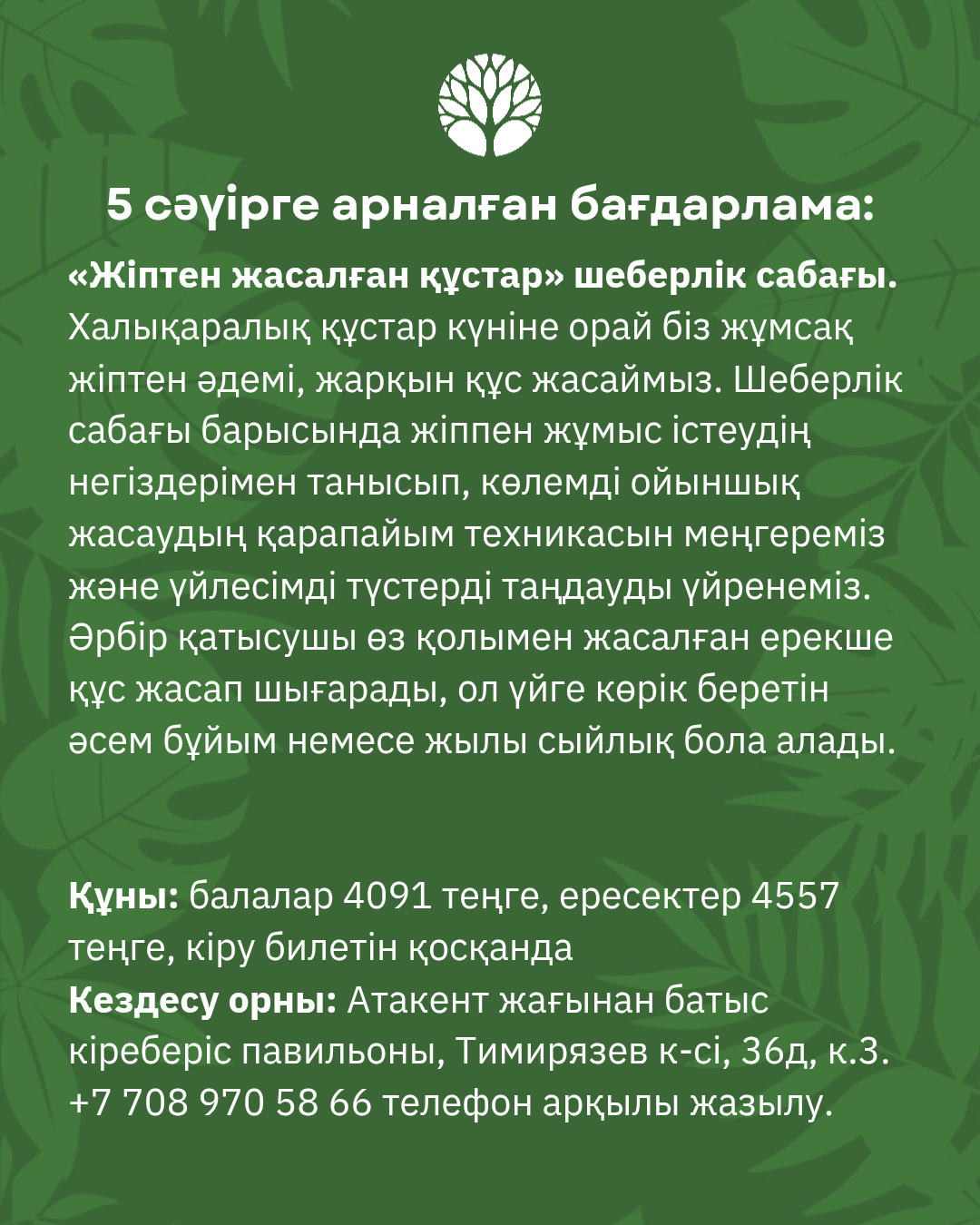 «Сүю үшін білу» білім беру бағдарламасы аясында, әр жексенбі сағат 11:00-де мектеп оқушыларын шығармашылық шеберлік сабақтарына шақырамыз. Мұнда табиғи материалдар ерекше жұмыстарға айналады, ал табиғатпен танысу — қызықты шығармашылық процеске. Әрбір қатысушы өз қолымен жасаған бірегей жұмысын үйге алып кетеді. Шеберлік сабақтарын Валерия Кураж жүргізеді. Толық бағдарлама карусельде көрсетілген.