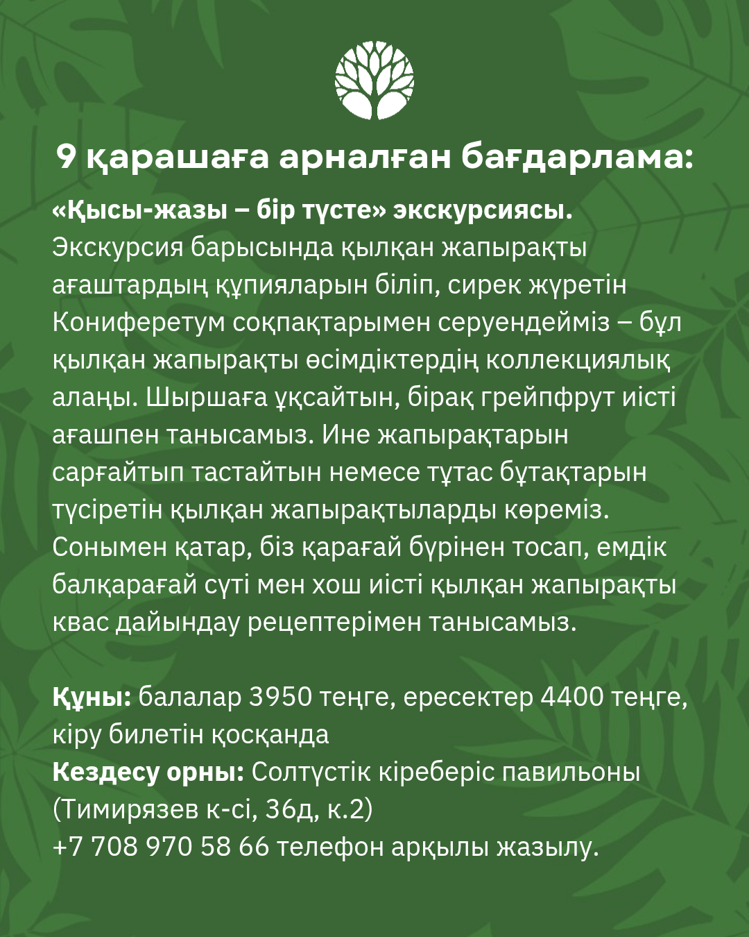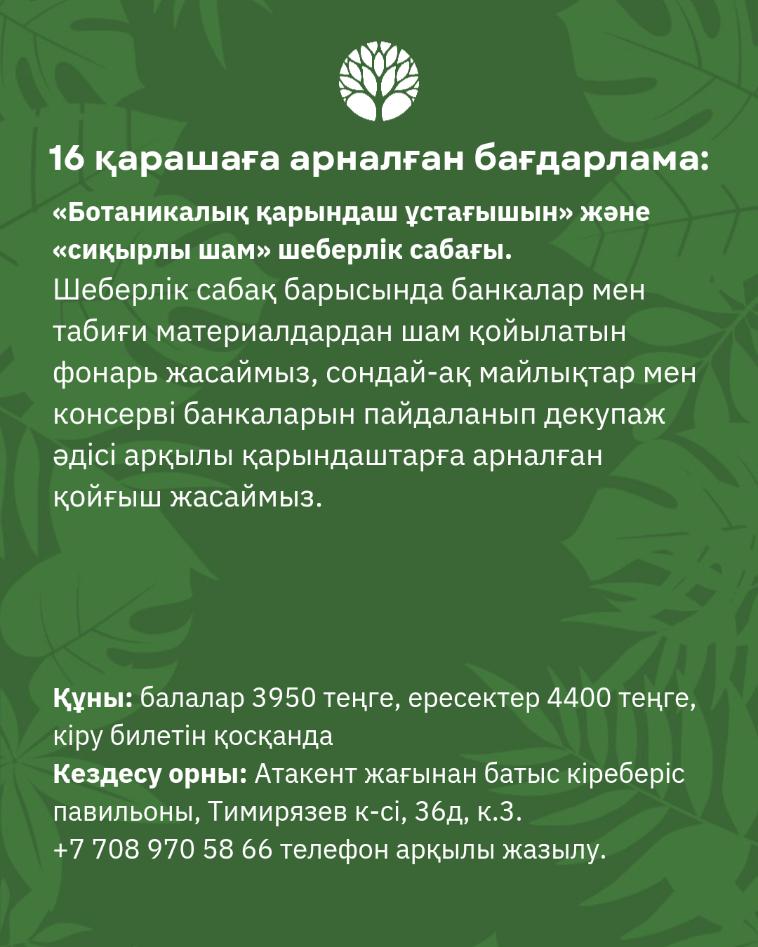 Орындар саны шектеулі, алдын ала жазылу қажет: +7 708 970 58 66.