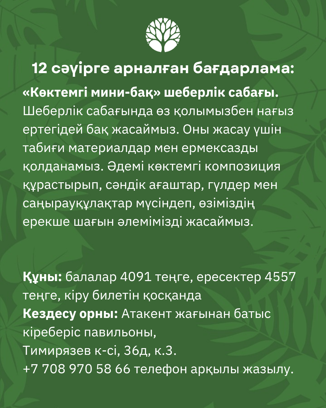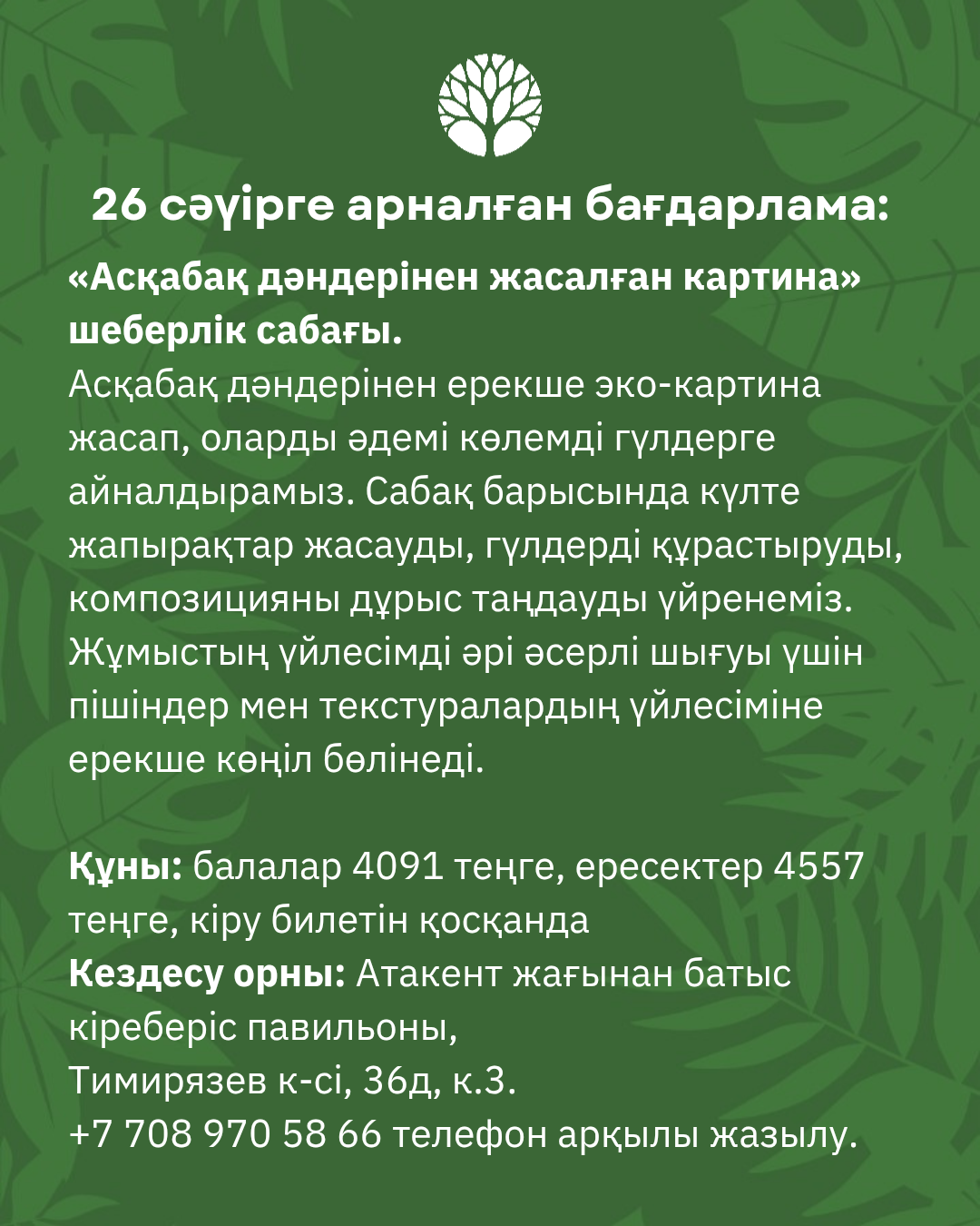 Орын саны шектеулі, алдын ала жазылу қажет: +7 708 970 58 66
