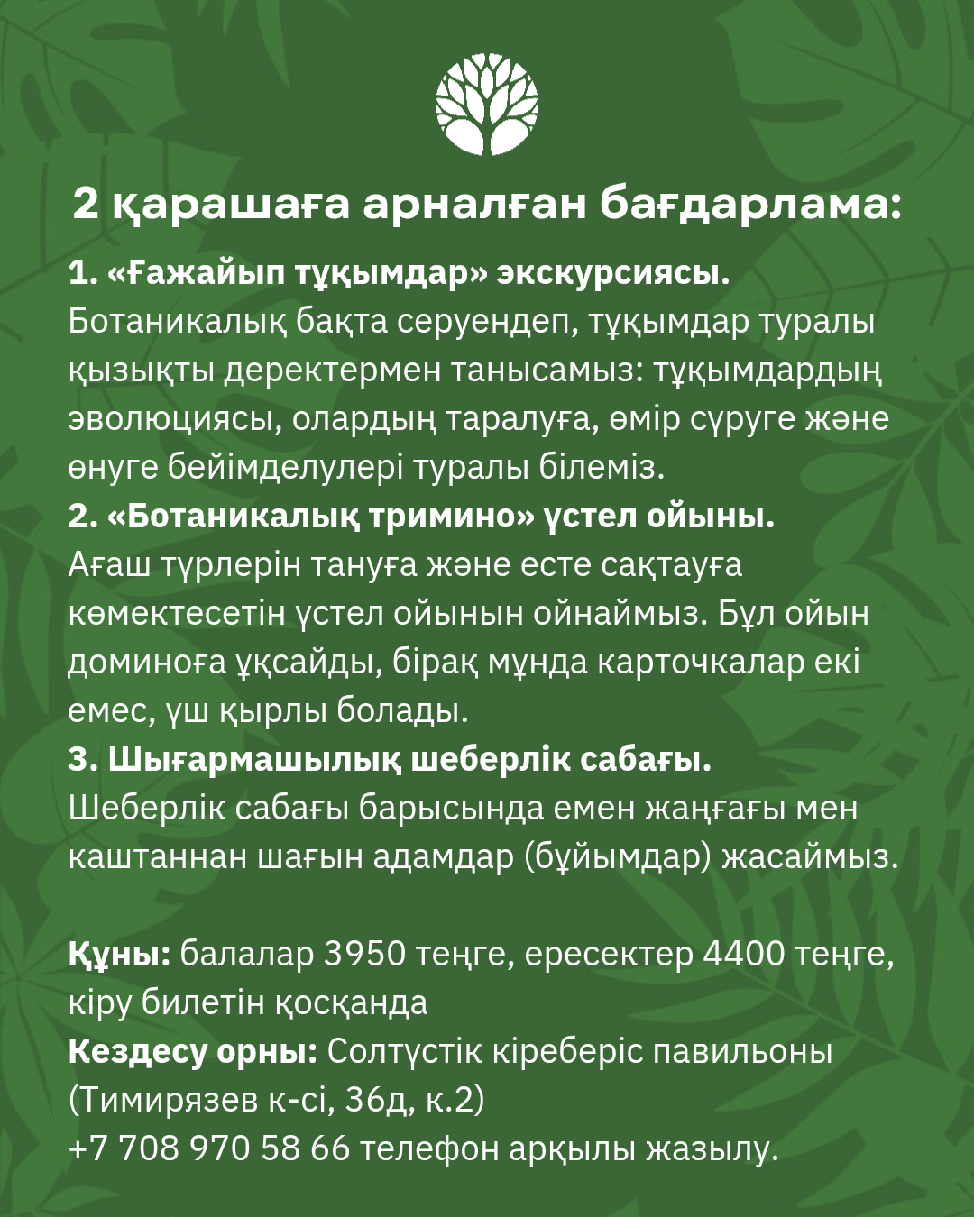 Орындар саны шектеулі, алдын ала жазылу қажет: +7 708 970 58 66.