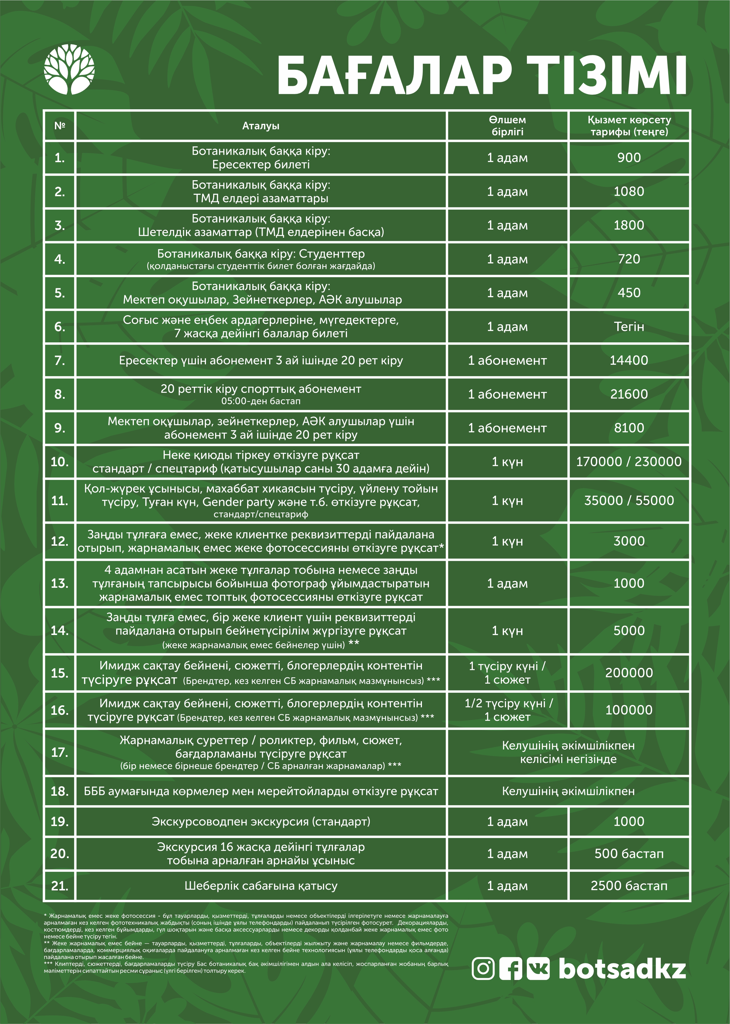 Прайс бағалары бойынша қызметтерге ақы төлеу Бас ботаникалық бақтың кіреберісіндегі касса арқылы жүзеге асырылады. Кіру билеттерін төмендегі нұсқауларға сәйкес онлайн төлем арқылы сатып алуға болады.